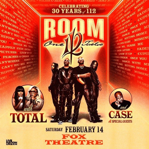 The "Room 112 Tour" (late 2025–early 2026) celebrates the Grammy-winning R&B group’s 30-year career with an intimate theater tour, featuring hits like "Only You," "Cupid," and "Peaches & Cream". Supported by Total and Case, the show focuses on nostalgia, smooth harmonies, and high-energy performances of 90s classics.